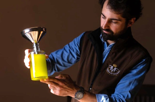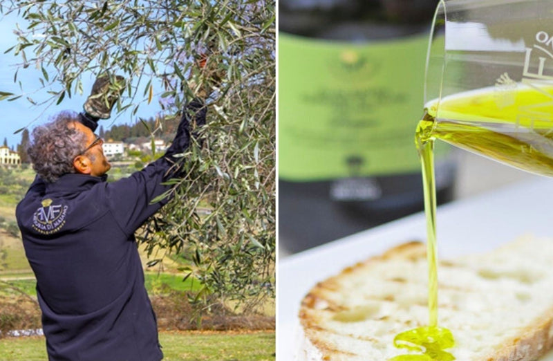 The olives used in Fattoria di Maiano's "Laudemio" are the "Frantoio" variety, native to Tuscany and characterized by its delicate spiciness, and the "Moraiolo" variety, which has a high polyphenol content and is very spicy.