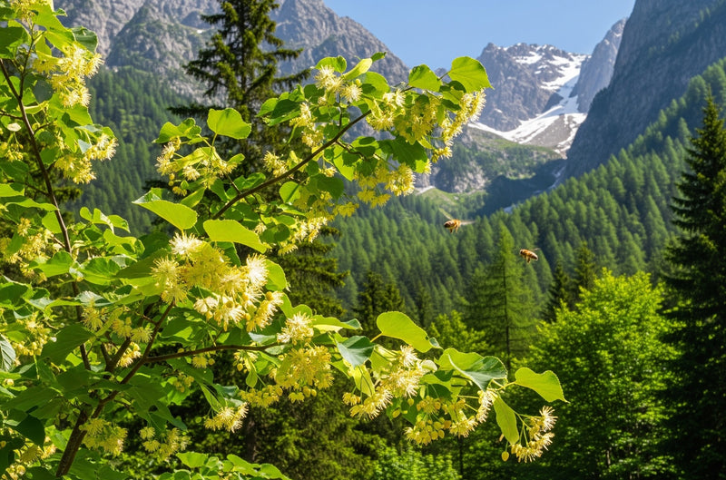 シナノキの蜂蜜は、透き通った淡い黄金色をしており、ボトルを傾けるたびに美しく輝きます。